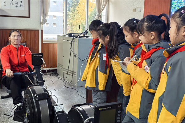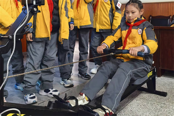 挥楫逐浪,赛场竞技显活力。理论讲解后,进入赛艇体验环节。胡森斌带领学生熟悉“收腿、伸手、蹬腿、拉回”的标准动作,针对身体前倾、发力方式等易错点进行悉心指导。随后,课程以智能软件显示距离的形式开展班级接力赛,听到“Go”的指令后,同学们整齐划桨、默契配合,赛场上传来阵阵呐喊助威声。智能设备实时呈现的比赛数据,让竞技更具趣味性,同学们热情高涨,充分展现了积极向上的运动风采。