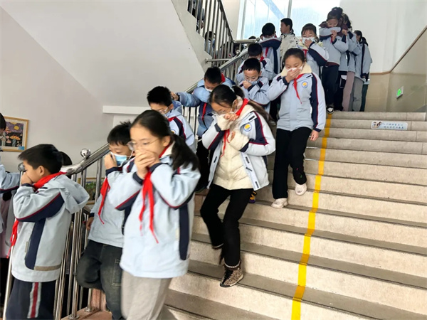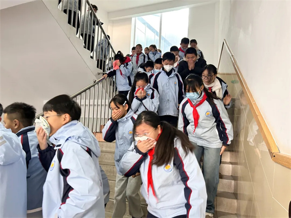疏散演练:高效有序撤离 9时05分,急促的警报声划破校园宁静,模拟火灾现场迅速弥漫浓烟。在教师引导下,学生迅速用湿毛巾捂住口鼻,沿预定逃生路线快速撤离。疏散过程中,学生严格遵循“不推挤、不逆行、不滞留”原则,仅用时2分36秒便全部安全抵达操场指定区域。