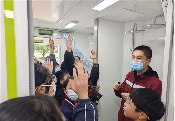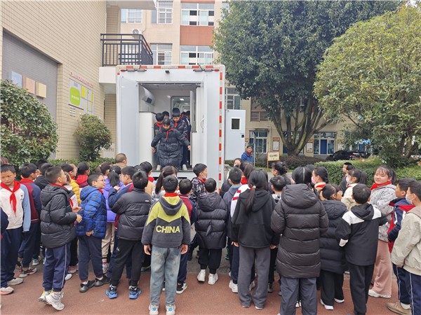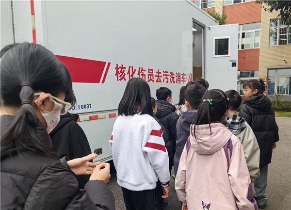 为弘扬科学精神,普及核医学知识,树立正确核安全观,近日,“核医未来 向‘新’而行”核医学科普教育培训活动走进成都市新都区繁江小学。本次活动由四川省科技厅、成都市科学技术局主办,成都医学院、成都医学院第二附属医院·核工业四一六医院承办,繁江小学高年级200余名学生参与其中。 活动以“核医学与核安全”为核心,设置展示体验与科普互动两大板块。 在操场展示区,五年级2班的同学们分批参观“核化伤员去污洗消车”及相关模型,四川核与辐射医学救援队的公利鑫、高晓芳老师详细讲解核污染防护知识,指导学生体验不同受伤污染部位的洗消流程,让大家直观感受核应急救援的实操要点。