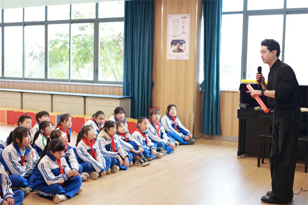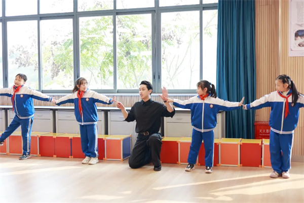 2025年11月24日下午,成都东部新区草池小学校音乐教室内举行了一场别开生面的“戏剧表演”讲座。本次活动以“表演的内在力量”为主题,聚焦表演元素训练,为四年级学生带来了一次前所未有的戏剧体验,让孩子们在艺术的熏陶中收获成长。 名师引领,启迪思维 本次讲座特邀大庸戏剧签约演员、四川戏剧家协会会员、国家三级演员李柯瑾老师担任主讲。他曾荣获重庆青年戏剧演出季优秀男演员、四川省“百家推优”工程最佳男演员等荣誉,代表作有《逆风》《杨闇公》《豆蔻年华》等多部优秀作品。 互动开场,激发兴趣 讲座伊始,李柯瑾以“什么是表演”为题与学生们展开互动。孩子们踊跃发言、各抒己见,现场气氛热烈,在轻松愉快的对话中开启了戏剧探索之旅。