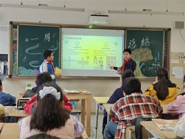 全班“共筑”安全防线 班级代表们将学到的交通安全知识带回班级,向全班同学进行分享。通过共同学习,安全理念进一步深入每一个东娃娃的内心。