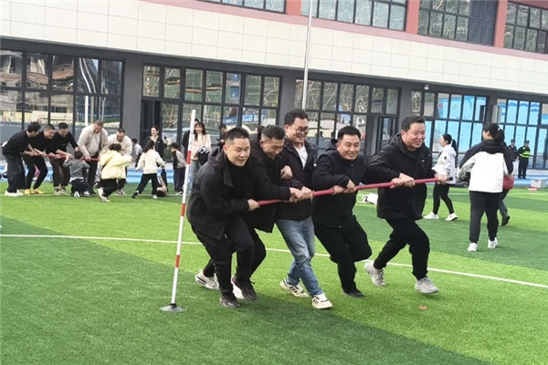 入场式与绳操比赛结束后,竞技环节正式开启。50米跑赛道上,发令枪响的瞬间,小选手们如离弦之箭冲出起点,双臂摆动、脚步疾驰,赛道旁的加油声此起彼伏。1分钟跳绳赛场同样热闹。小选手们站定、握绳、发力,绳影翻飞如蝶舞,“呼呼”绳声与计数员的报数声交织。50米迎面接力赛更考验默契。各班参赛选手分站赛道两端,每一次击掌交接都是信任与协作的延续,每一次奋力追赶都赢得乐全场喝彩。拔河赛场更是高潮迭起。各队30名同学紧握长绳,脚蹬地面、身体后倾,红绸带在中线两侧激烈拉锯。“加油!加油!”的口号声震耳欲聋,场边师生与家长的加油声浪层层迭起。胜利哨声响起,队员们相拥欢呼,团结的荣光在这刻熠熠生辉。