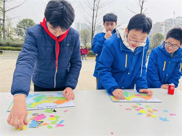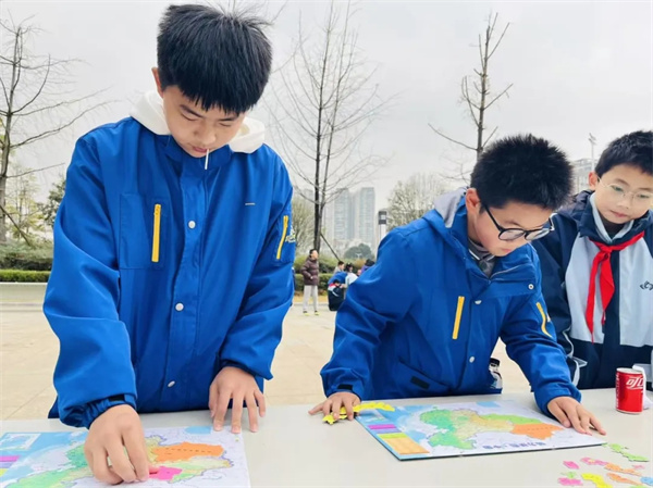 飞盘活动 学科探索·妙趣体验 在学校迎宾大道旁,老师们将“传统课堂”变为“趣味游戏”,将学科知识融入游戏活动之中。同学们通过现场挑战,巧思解谜、动手实验、合作闯关……欢笑声与喝彩声此起彼伏。 在“我的中国心之中国地理拼图大赛”游戏现场,同学们PK组装地图,争分夺秒地辨认、拼合山川湖海。这不仅是在比拼手速与精度,更是一次对中国地理轮廓的亲手触摸与知识温习。