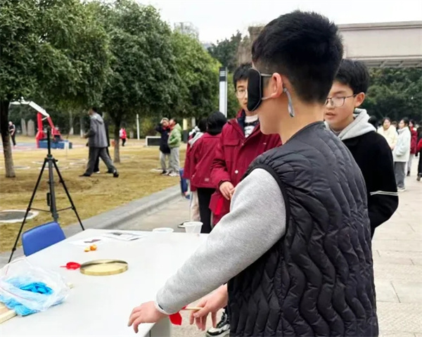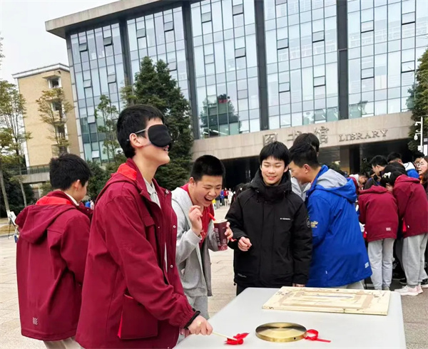 在数学学科的“盲人击鼓”活动中,同学们蒙眼转圈后,闭着眼摸索前行,朝着鼓点方向迈步,成功击中鼓面的瞬间,现场立马响起阵阵欢呼喝彩声。