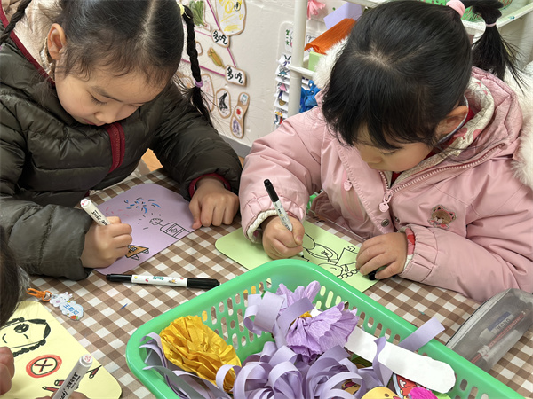 三、创意宣传 践行安全 在创意实践环节,跳跳龙班的幼儿结合班级项目活动《有间花店》开展“安全警示花卡”创作活动。孩子们将安全标语与花艺设计相融合,手工制作花卡、手绘安全图标,制作出一张张兼具美观与实用的警示花卡,充分展现了项目赋能下幼儿的实践探究能力。大班组各班级则组织幼儿绘制“烟花爆竹安全宣传画”,用画笔触勾勒出烟花爆竹的安全提示场景。