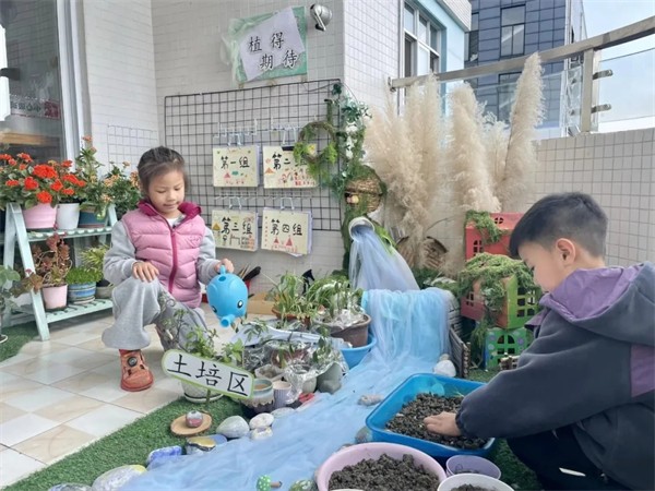 新学期的班级植物角已经焕然一新,成为了孩子们的“垂直森林”。他们化身小小设计师,精心安置自己带来的绿萝、多肉等植物,松土、浇水、制作专属植物名牌,每一个步骤都认真细致。这片小小的天地,不仅美化了教室环境,更成为了孩子们观察生命、学会责任的重要课堂。
