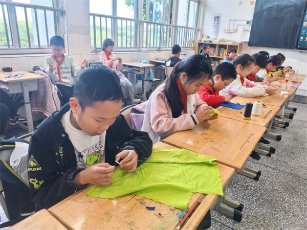 三、四年级:心灵手巧,纽扣缝牢 10分钟内,选手们飞针走线,规范缝制带脚、双眼、四眼三种纽扣,做到针脚均匀、纽扣牢固、线头整齐、排列笔直,工具使用安全规范,尽显细心与耐心。
