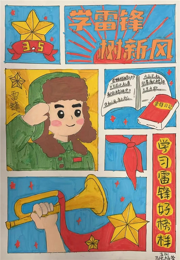 从3月21日开始,同学们就开启了创作模式!美术课上认真构思,课余时间用心描绘,周末也不忘打磨细节。大家的作品超有料:有的一笔一画画出雷锋叔叔的感人事迹,有的细心记录身边同学帮老师搬书、给同学讲题的暖心瞬间,还有的写下自己学雷锋做好事的真实感悟,每一份作品都紧扣主题,满是正能量!而且大家都严格遵守要求,用A3画纸手绘创作,素描、彩铅、水彩各种画法齐上阵,版面设计创意满满,字里行间全是诚意。