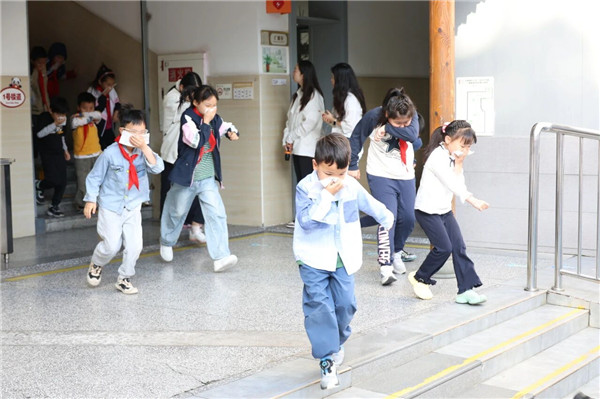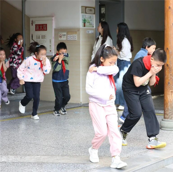 练在实:警报响起,有序撤离 随着警报声响起,全校师生立即响应:正副班主任迅速组织学生捂住口鼻,弯腰沿预定通道撤离;各楼层疏导员在转角、楼梯口等关键点位精准指引,不断提醒“脚下看清”“保持间距”。全校师生安全、迅速疏散至操场指定区域,整个过程紧张有序。