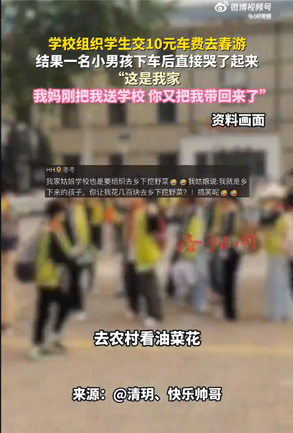 近日,山东。学校组织学生交10元车费去春游,结果一名小男孩下车后直接爆哭。 老师安慰后,男孩说:这是我家,那油菜花还是我和我爷爷一起种的,我妈刚把我送到学校,你又把我带回来了,你赔我10块钱。