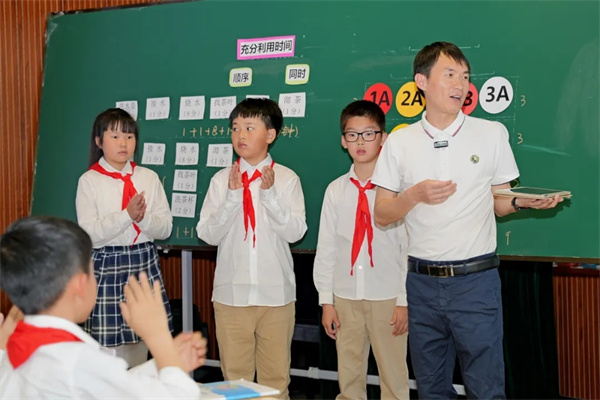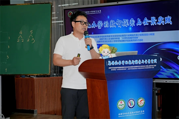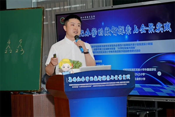 多年来,实小教育集团以数智之力推动教育从“经验判断”走向“循证优化”,用数据记录课堂互动、习作学情、成长轨迹,以智能工具为教学导航、为成长赋能;构建空间无界、环节闭环、角色共生的全景育人生态,实现集团7所学校资源自由流动、教研学评管全环节贯通;深耕课堂革命,以“三段四环”循证教研让人机协同成为教学新常态,最终以数字工具加速师生成长,坚守育人本质,向教育价值深处漫溯。 融智·课堂 数据循证的破冰之旅 双流实小王忠涛老师带领的4年级8班学生与九江小学卢林老师带领的4年级4班学生联动,共同呈现四年级《数学好好玩·优化》跨校双师课。