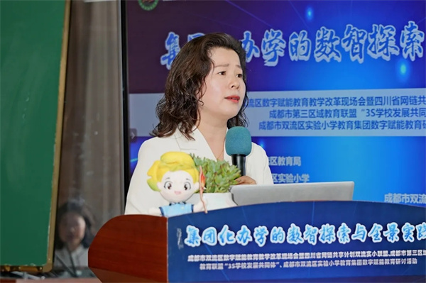 启智·观澜 九秩实小的数智应答 成都市双流区实验小学教育集团总校长闫瑾发表致辞。闫瑾在致辞中全面阐释“数字赋能·全景育人”的核心理念,并介绍集团数字化建设的历程。