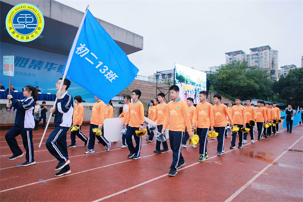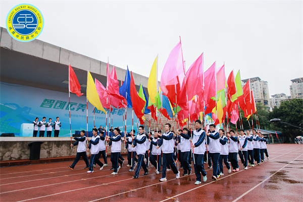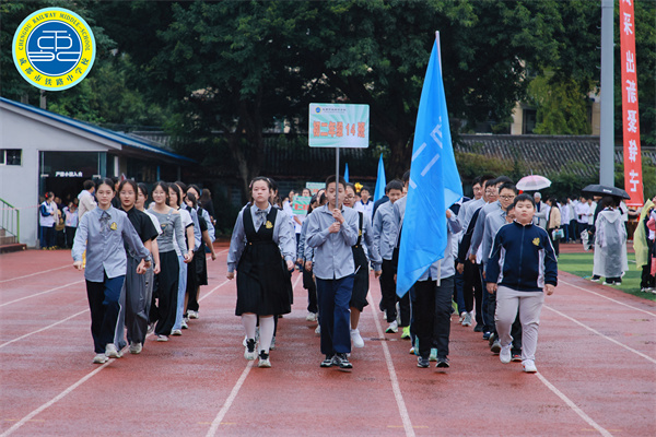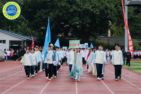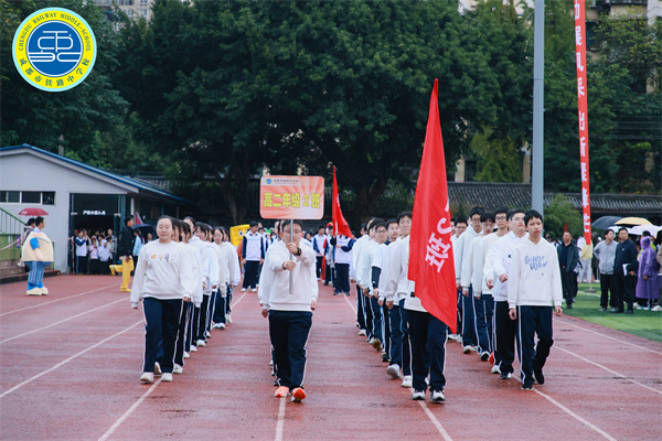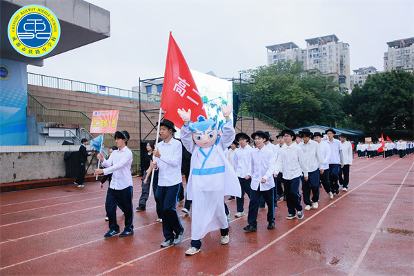 开幕式亮点纷呈:智慧与青春的交响 开幕式在庄严的升旗仪式中拉开序幕,全体师生齐唱国歌,现场气氛庄严肃穆。随后,国旗护卫队、校旗队、彩旗队及学生运动员代表队依次入场,各班级方阵以独特的创意和昂扬的姿态亮相。初一年级以“青春启航”为主题,展现出新生力量;初三年级则以“决战中考,青春无悔”的口号彰显拼搏精神;高二年级多个班级融入科技元素,如高二五班以“智慧浪潮”为主题,高二九班结合中西文化演绎《卡拉永远OK》与《What is love》,彰显国际化视野。
