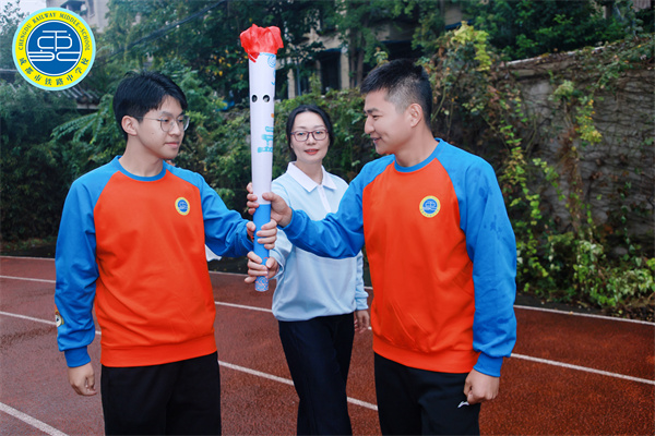 火炬传递仪式将开幕式推向高潮。象征“铁军”精神的火炬“炽焰”由学校IP形象代表“铁小创”传递至教师代表手中,最终由党委书记胡铃冬点燃主火炬。火炬手队伍涵盖优秀教师、学科带头人及学生代表,传递过程寓意铁中精神的薪火相传与创新发展的决心。
