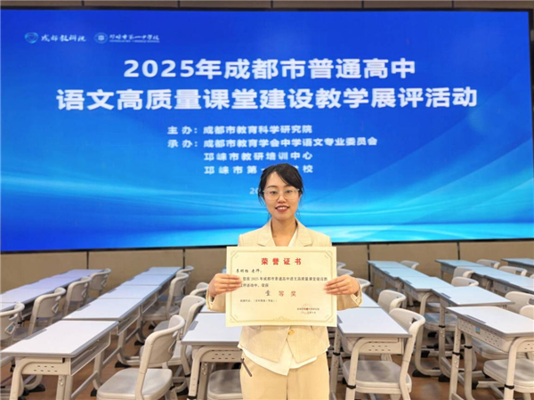 2025年10月23日,由成都市教育科学研究院主办、邛崃市第一中学承办的成都市普通高中语文高质量课堂建设教学展评活动顺利举行。 成都市第三十七中学语文老师李明杨在区选拔中脱颖而出,代表青羊区参加了此次赛课。凭借出色的教学表现,她执教的《百年孤独(节选)》一课荣获本次展评课一等奖!