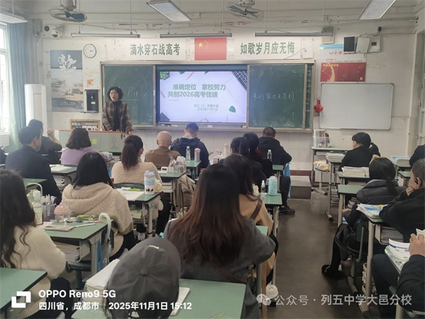 为凝聚教育合力,助力学子逐梦高考,2025年11月1日下午,大邑县实验中学高2023年级召开了以“家校同心,携手奋进,共同托起孩子们的未来”为主题的家长会,为家校搭建起深度沟通的桥梁。 同心聚礼堂,共启冲刺程 年级组长牟庆红作开场发言。牟庆红对家长们参会表示热烈欢迎,他围绕高三阶段的特殊性,简要阐述了本次家长会的核心目的——通过家校紧密配合,让家长清晰了解学情、明确陪伴方向,共同为孩子营造高效、温暖的备考环境,为高考冲刺注入“家校同心”的力量。