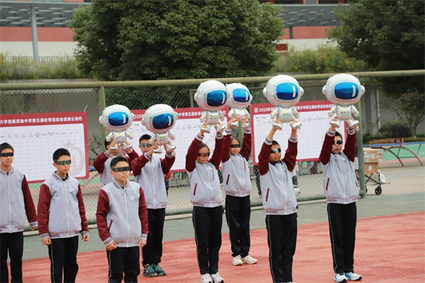 分级主题,创意入场 开幕式上,最引人注目的是各年级围绕特定主题打造的创意方阵。七年级以“童心筑梦·点亮未来”为主题,同学们手持科技感十足的LED灯牌、星星和机器人道具,在充满未来感的音乐中舞动,用纯真与想象点亮运动梦想。八年级紧扣“青春同行·强国有我”的主题,挥舞着“强国有我”的横幅,身着象征各行各业的职业服装,以昂扬的姿态和红歌新编的律动表演,展现新时代青年的责任与担当。九年级学子则以整齐划一的四路纵队昂首进场,他们步伐铿锵,口号响亮:“附中学子,每一个都不简单!” 充分展现了毕业班学子饱满的斗志与凝聚力。