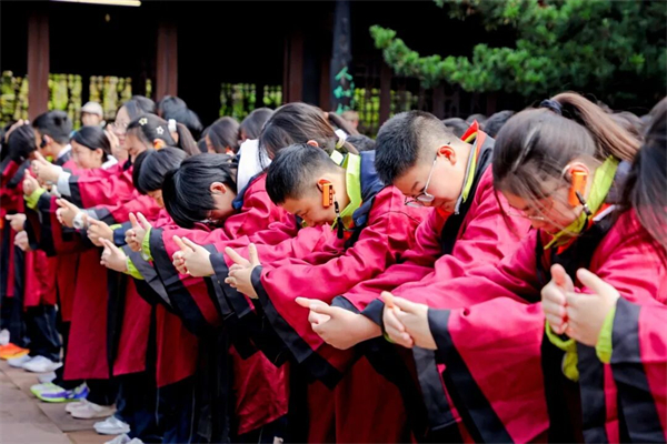 初二年级:青神+三苏祠 在竹编与祭拜中,触摸文化的温度 “原来竹丝可以编成画”初二7班的李同学在返程大巴上还在翻看自己编的竹叶书签。 在青神,同学们亲手体验竹编技艺,观看憨态可掬的大熊猫;在三苏祠,他们穿上汉服参与祭拜仪式,聆听“一门父子三词客”的千古佳话。有同学在研学笔记中写道:“从前在课本里读《赤壁赋》,今天终于走进了苏轼的世界。”