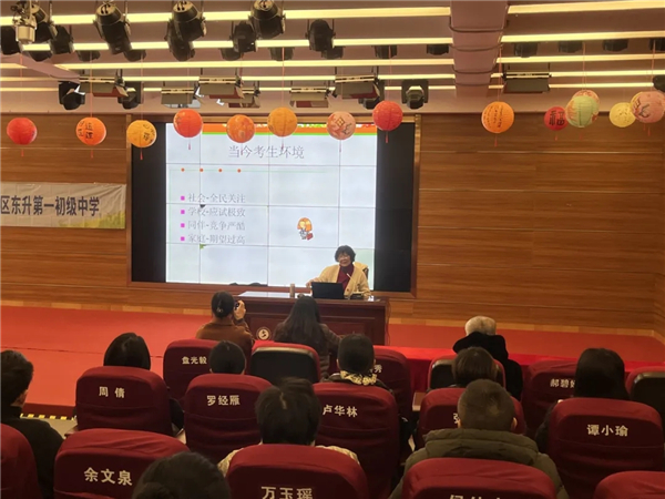 为帮助九年级家长缓解孩子在升学阶段的焦虑情绪,科学助力孩子备战中考,12月25日,由新东方家庭教育研究与指导中心主办的“新东方家庭教育中国行”公益讲座在成都市双流区东升第一初级中学(以下简称:东升一中)东升讲堂顺利举行。本次讲座特邀著名儿童青少年心理教育专家陈默老师主讲,以《家有考生》为主题,为现场九年级家长带来了一场干货满满的家庭教育指导,活动由德育安全处副主任吴小莉主持。