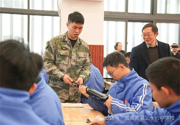 调研团循着校园国防教育建设脉络,先后走访钟楼、长征大道、拥军广场、校史馆、国防展厅等特色场所,在实地观摩中,直观感受学校将国防元素融入校园环境的匠心设计,深切体会“为党育人、为国育才”办学宗旨的生动实践。随后,调研团走进国防教室,观摩国防教育示范课与轻武器射击体验活动,课堂上,理论讲解与实践操作有机结合,学生们专注参与枪械组装实践,一拆一装间,组装的是枪械零件,增长的是家国担当,充分展现学校国防特色课程的鲜明亮点与扎实成效,为国防教育课程建设提供了可借鉴的川渝经验。