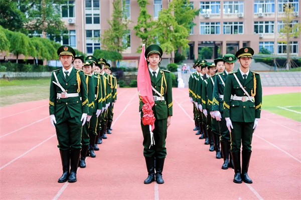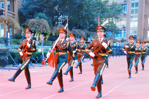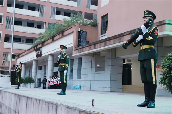 为深入推进学校“双色德育”课程体系建设,将爱国主义教育融入实践体验,12月22日上午,由锦江区爱国拥军联合会与四川星兵连国旗护卫队联合主办的“国防教育进校园”主题活动在成都市七中育才学校举行。活动特邀天安门仪仗队退役军人组成的国旗护卫队走进校园,为全校师生带来了一堂生动而深刻的国防教育公开课。锦江区爱国拥军联合会秘书长陈林、成都市国防教育学会副会长张忠铭等嘉宾出席活动现场,与全校师生共同参与了这场精神洗礼。此次活动不仅是国防教育的一次生动实践,更是学校双色德育课程体系中的重要一课,旨在通过课程化、沉浸式的活动设计,增强青少年的国防观念,厚植爱国情怀。 庄严升旗,致敬旗帜 活动在激昂的《歌唱祖国》中拉开序幕。四川星兵连国旗护卫队迈着整齐划一、铿锵有力的步伐执行升旗仪式。全体师生肃立注目,少先队员行队礼,在庄严的国歌声中,五星红旗冉冉升起,爱国情怀在每一名师生心中升腾。