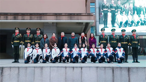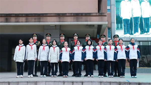 红领巾致敬,传承爱国精神 活动最温暖动人的时刻,定格在少先队员们为星兵连战士敬献红领巾的瞬间。当庄严的《中国少年先锋队队歌》响起,教官们贴心地单膝触地,配合育才学子完成红领巾佩戴仪式,这一细节让在场师生深受感动。这一敬一献之间,不仅是敬意的传递,更是精神的传承。相信今日稚嫩的少年,终将成长为守护祖国的新一代脊梁。仪式结束后,校区执行校长王蓓、党总支书记、副校长张自力、校长助理敬仕凤、校长助理谢春玲与嘉宾、星兵连战士合影留念。