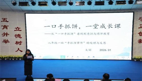 2026年1月30日,西南财经大学附属实验中学召开2025-2026学年度第一学期期末总结大会。部分教师代表和各教研组以骏马之姿,围绕“班级管理与育人艺术,AI赋能循证教研的校本实践”分享了他们扎根自主课堂、凝练教研经验的深厚智慧与温暖情怀。教管中心蔡祖民主任、乐山师范学院徐文基教授以及西南财经大学附属实验中学全体教师出席了本次会议。大会由研培部负责人蒋漓主持。 管理有道:自主教育理念下的班级治理智慧 班级突发事件处理与治班策略分享环节,四位老师系统呈现了从危机管理到常态建设、从集体塑造到个体修身的自主教育理念下的治班智慧。