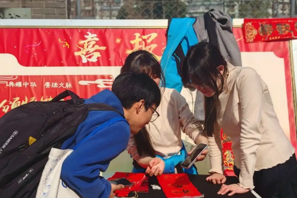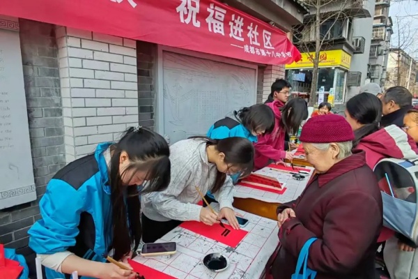 校园之内,墨香满庭,书法社是学子们以笔会友、锤炼技艺的一方天地。日常社团活动中,同学们凝神静气、临帖习字,在横竖撇捺间感受汉字的形韵之美,在笔墨流转中沉淀内心的从容与专注。笔墨的练习,是技艺的打磨,更是心性的涵养,书法社以沉浸式的学习体验,让同学们在日积月累中领悟坚持的意义,在相互切磋中凝聚向上的力量,让“向上”的成长底色在墨香中愈发鲜明。 校内送福