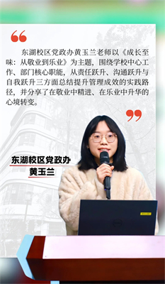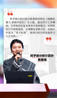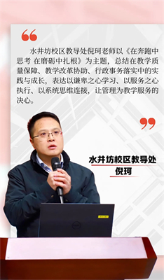 总结会伊始,各校区及分校的后备人才代表依次登台,围绕本学期参与的行政管理工作、收获体会、未来规划与困惑思考进行集中分享。在有限的时间内,代表们以精练的语言、清晰的逻辑、饱满的情感,生动呈现了跟岗期间的实践画卷。