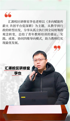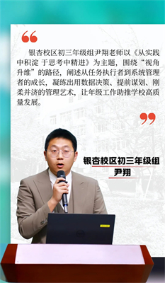 从教学管理到德育创新,从活动策划到团队协作,一个个真实案例折射出后备人才在实践中锤炼、在反思中成长的扎实足迹。总结分享不仅展现了个人成长,更凝聚了各校区的管理智慧,为集团人才梯队建设提供了鲜活的一线声音。