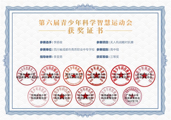 与此同时,在全国十一省科协主办的第六届青少年科学智慧运动会无人机战略对抗赛中,青苏职中无人机社团金义顺、雷冰颖、李扬俊、罗健洲、吴金波、张梓键、赵俊玮、钟奇钰凭借扎实的技术功底、灵活的战略思维与默契的团队协作,在激烈角逐中脱颖而出,斩获此项赛事的三等奖。