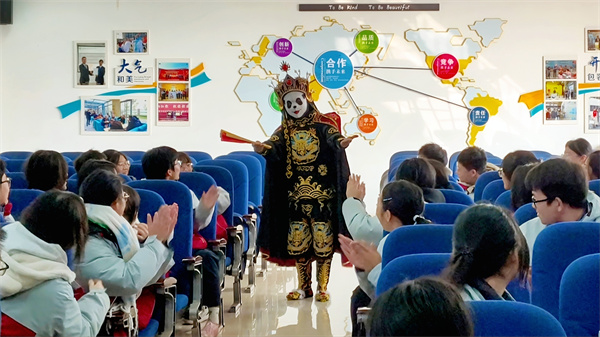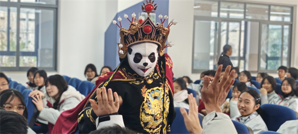节目鉴赏:绝活互动点燃全场 压轴的节目鉴赏环节,蒋老师现场展示美猴王棍法,刚劲利落的招式引得阵阵喝彩;紧接着,另一位川剧艺术家献上经典的变脸表演将氛围推向高潮,舞台上脸谱飞速变幻,表演尾声,艺术家走下舞台与同学们近距离互动,邀请大家亲手触摸戏服、感受变脸的神奇魅力,现场欢呼声此起彼伏。